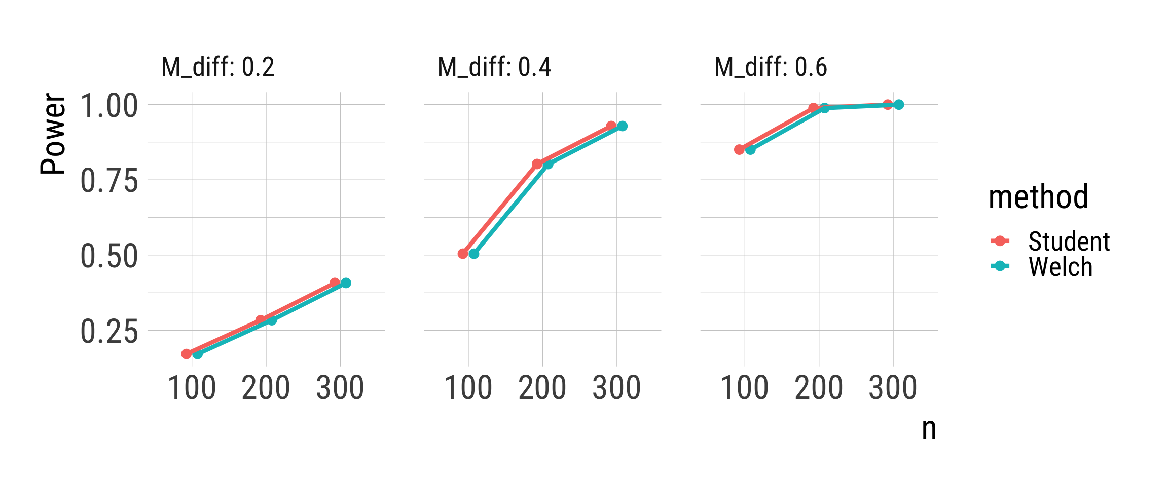 sim_ttest =function(n =200, GR =1, SDR =1, M_diff =0) { n1 =round(n / (GR +1)) n2 =round(n1 * GR) sd1 =1 sd2 = sd1 * SDR # sd2/sd1 g1 =rnorm(n = n1, mean =0, sd = sd1) g2 =rnorm(n = n2, mean = M_diff, sd = sd2) res =t.test(g1, g2)$p.valuereturn(res)}sim_ttest(n =300, M_diff =0.3, GR =0.5)
