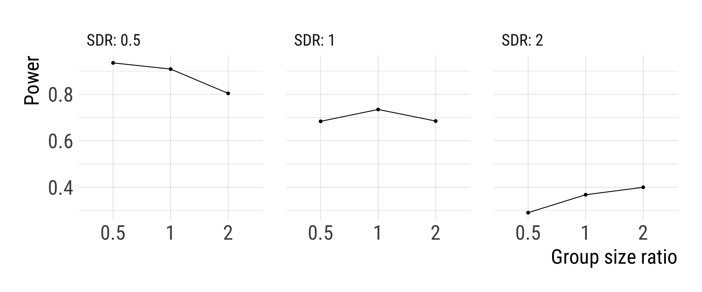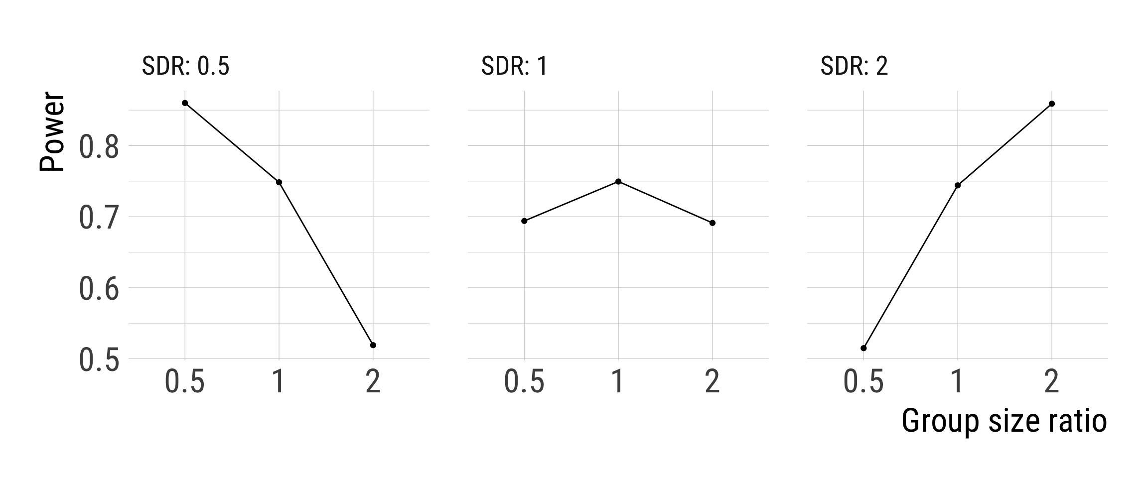We know less about the role of group sample sizes and group standard deviations differences, so this is what we want to investigate in the simulation.