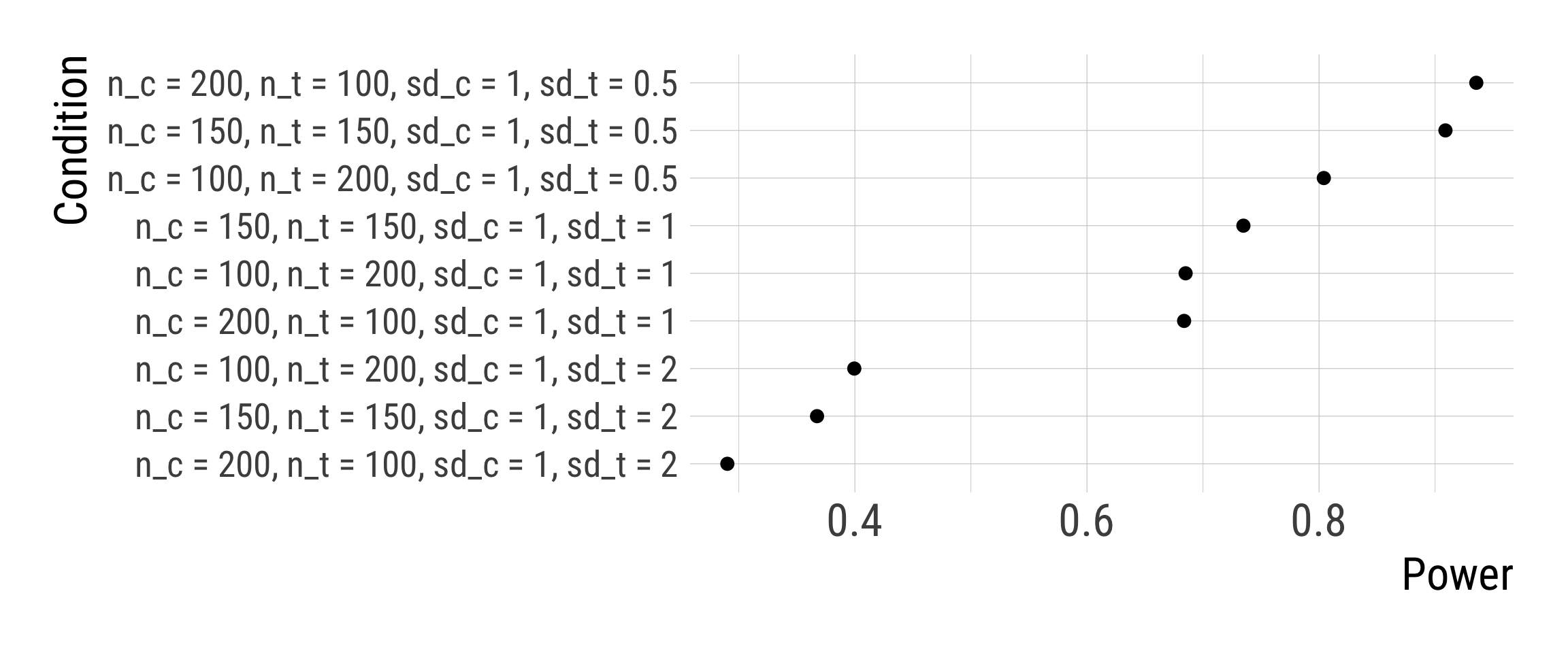 # It makes sense to vary group size ratio, lambda, and M_diff# The positive relationship between n and power is trivialconditions =expand_grid(GR =c(0.5, 1, 2), n =200,lambda1 =c(1, 10, 20),M_diff =c(0.3, 0.5, 0.8)) %>%rowid_to_column(var ="condition")