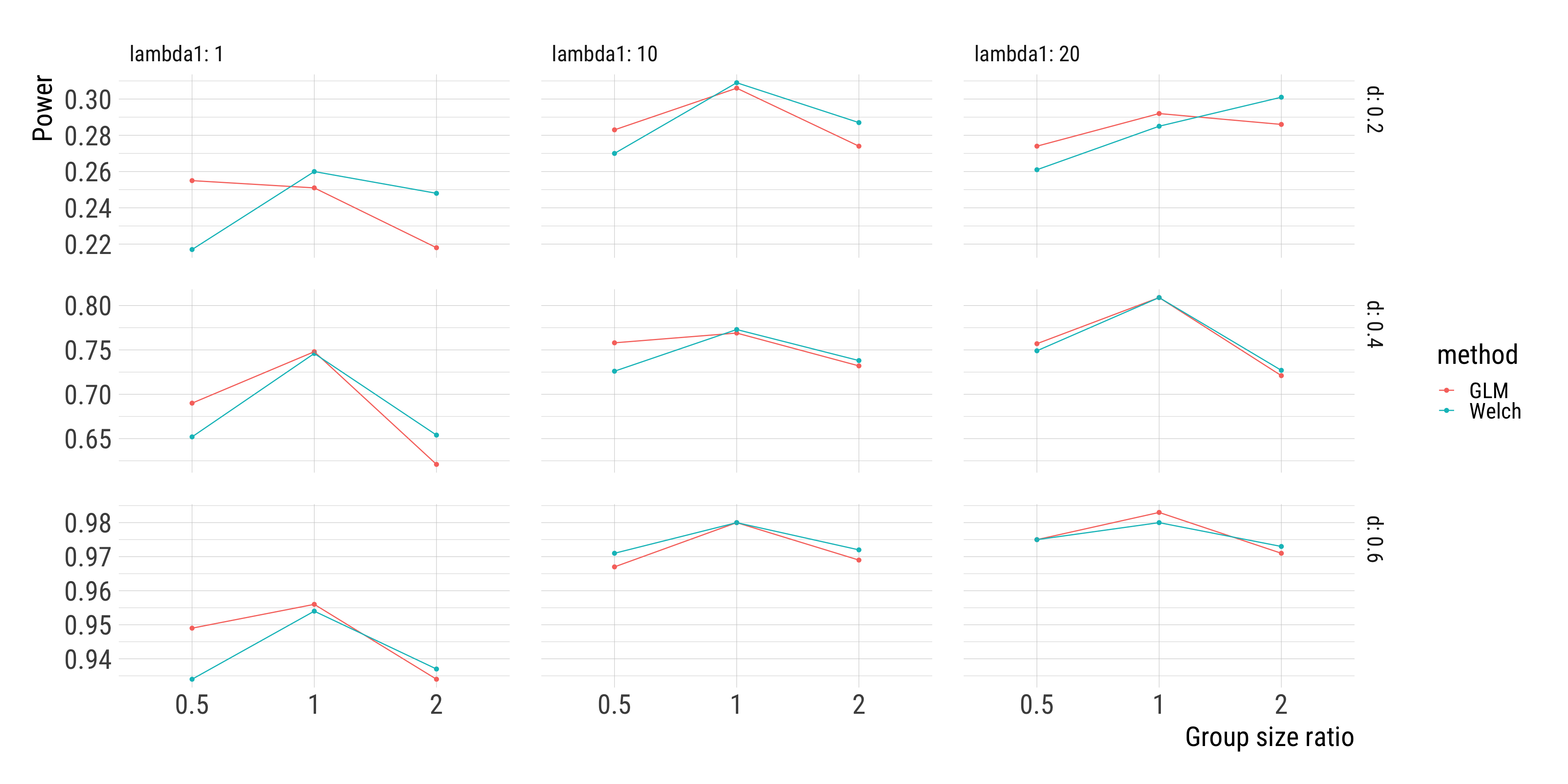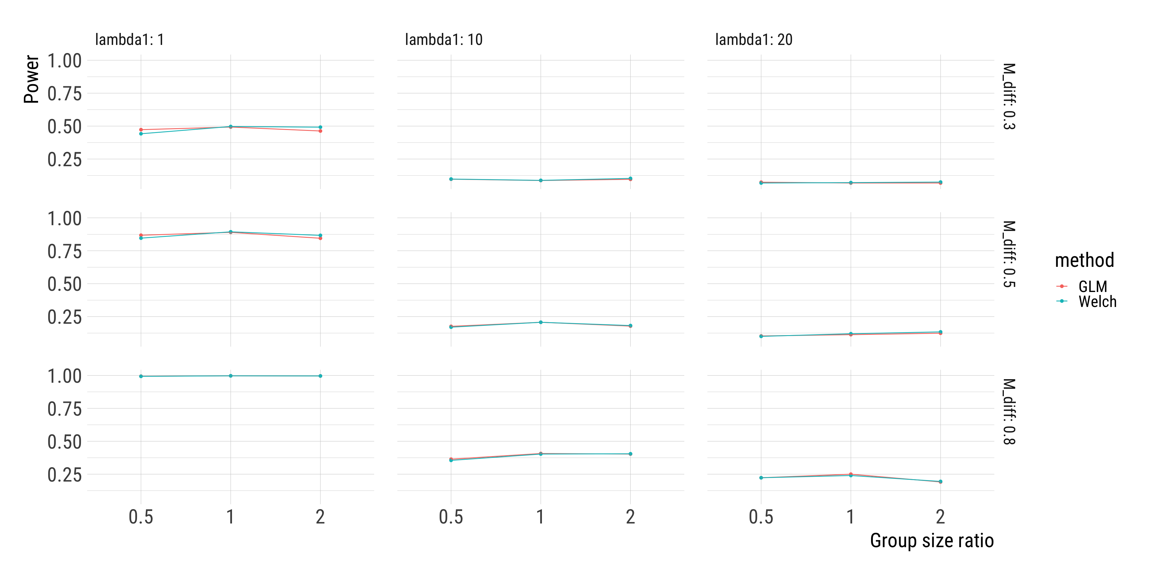 Welch’s t-test and Poisson regression perform very similarly in terms of statistical power.