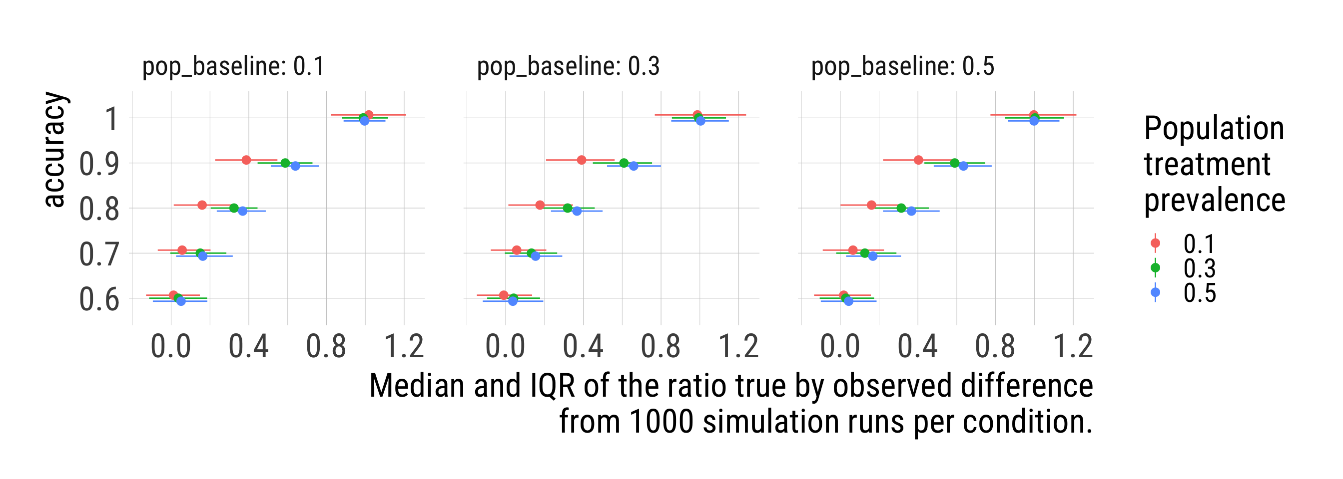 x = str_glue("Median and IQR of the ratio true by observed difference\nfrom {i} simulation runs per condition."),