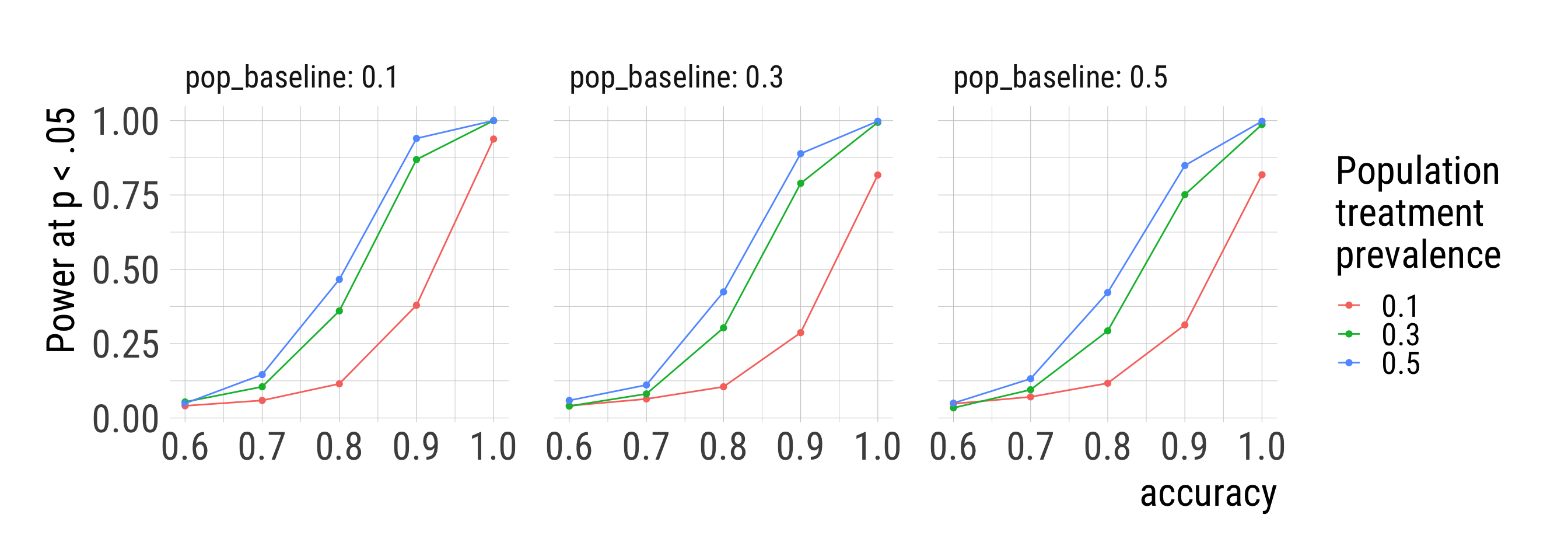 labs(y = "Power at p < .05", color = "Population\ntreatment\nprevalence")