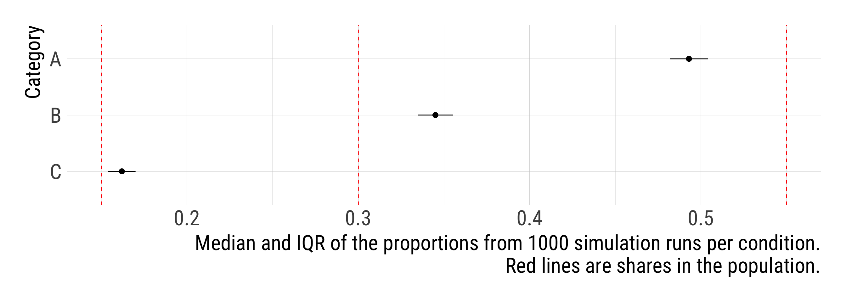 labs(x = str_glue("Median and IQR of the proportions from {i} simulation runs per condition.\nRed lines are shares in the population."),